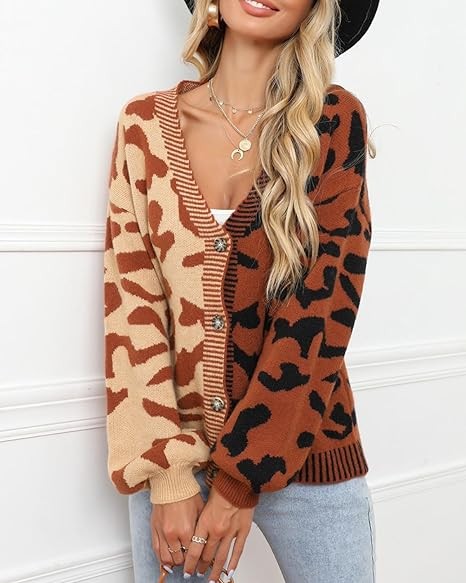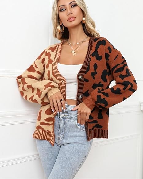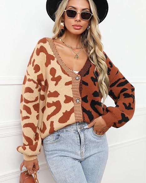 UEEKOOK Leopard Color Block Patchwork Women's Knit Cardigan Sweater Button Down Short Coat Outwear